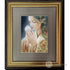胸元に抱き寄せた月をそっと見つめる表情と、衣に織り込まれた文様や紅の飾りが、あたたかな月の気配と祈りのような静けさを感じさせます。インチサイズの額装込みでお届けいたします。